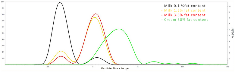 Particle size determination by means of laser diffraction is used in quality control as well as in research and development. One statement that can be obtained by analyzing milk and cream in this way is that concerning the homogenization of the product. This in turn allows conclusions to be drawn about the stability of the product and whether the product is appropriately protected from so-called creaming.