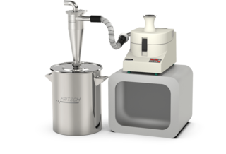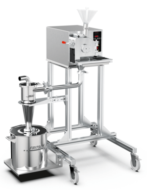 Fig. 2: Left side shows the PULVERISETTE 19 cutting mill system, shown with high-performance Cyclone separator mounted to 60 L collecting vessel.