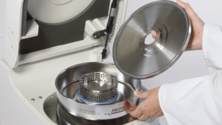 Fig. 1: Inside of a Variable Speed Rotor Mill PULVERISETTE 14 classic line, showing fixed collection vessel, rotor and sieve ring. The high-performance Cyclone separator made of stainless steel is shown on the right.