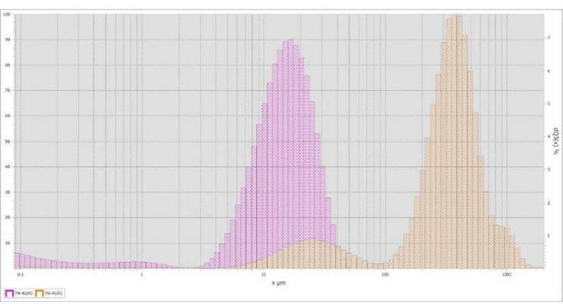 Fig. 3: The ANALYSETTE 22 was used to measure CBD isolate before & after homogenization. Starting CBD sample (orange) contained a mixture of loose granules with a wide particle size distribution. Material homogenized using the Variable Speed Rotor Mill PULVERISETTE 14 classic line (purple) resulted in a particle size consistency similar to talcum powder.